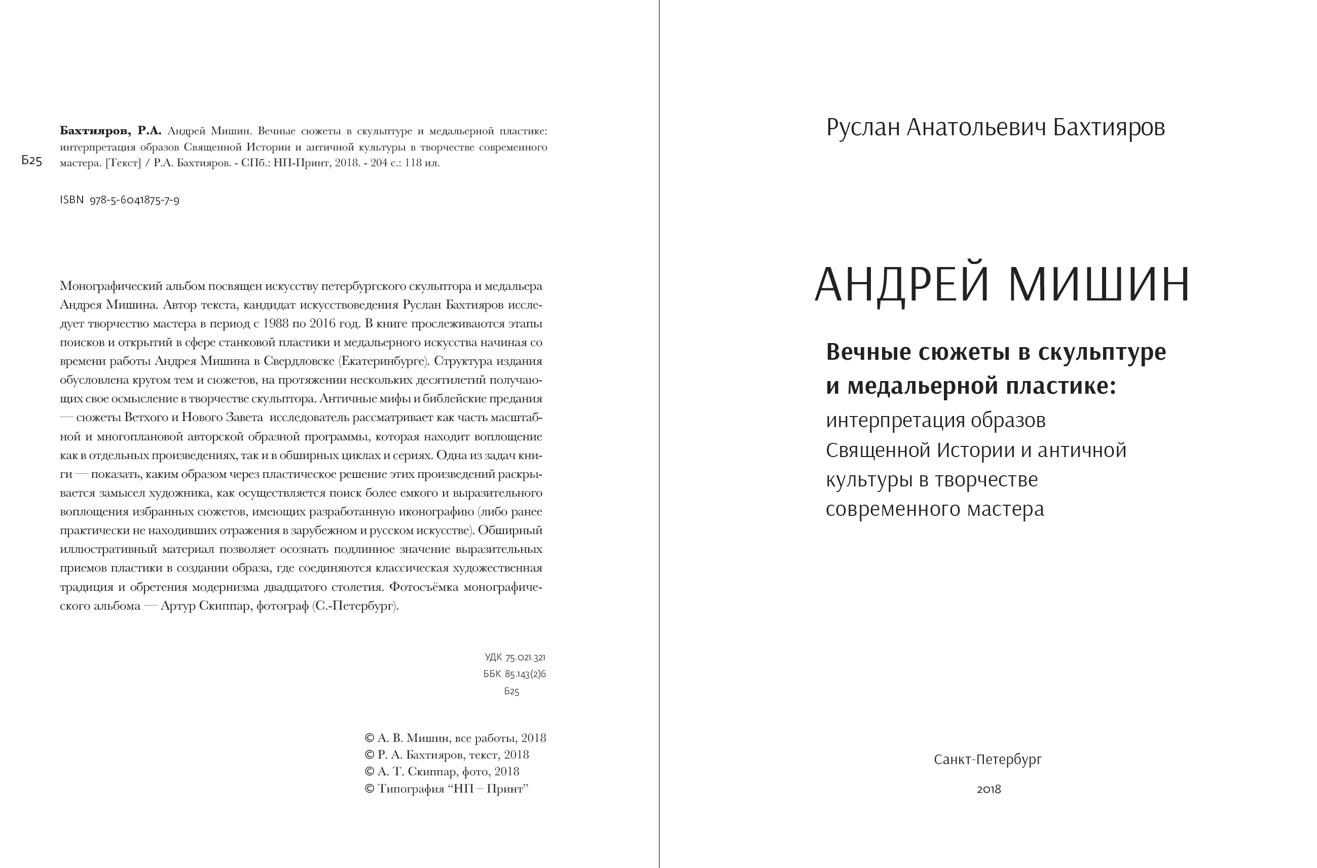Р.А.Бахтияров. Андрей Мишин. Вечные сюжеты в скульптуре и медальерной пластике: интерпретация образов Священной Истории и античной культуры в творчестве современного мастера / [Текст]. СПб.: НП-Принт, 2018 - 204 с.: 118 ил.