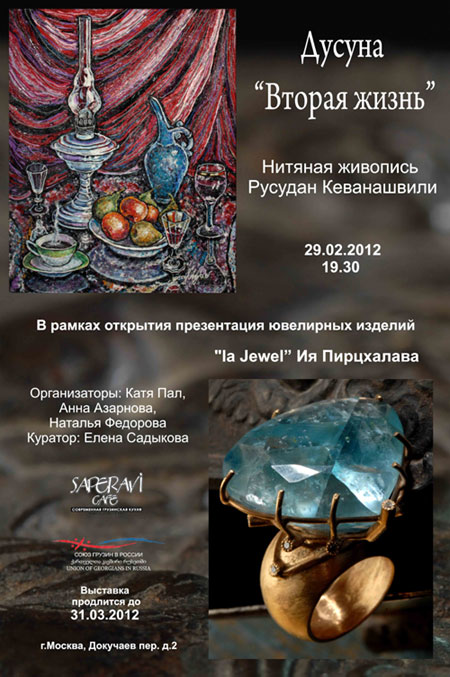 Идейный вдохновитель и душа проекта «Дусуна» – Катя Пал, которая впервые привезла картины Дусуны в Россию и успешно провела в 2011 году ее две выставки в кафе «Август» и Галерее Анны Азарновой. Сегодня впервые художник получил возможность приехать в Россию и открыть свою новую персональную выставку. «29-е февраля – последний день зимы. Мы не случайно выбрали именно этот день, чтобы познакомить зрителей с творчеством нашего любимого автора. Для нас Грузия – страна солнца и тепла, ярких красок и весёлого праздника. Мы приглашаем всех разделить нашу любовь к Грузии и к её художникам», – говорят организаторы выставки Катя Пал, Анна Азарнова и Наталья Федорова. В день открытия гостей также ждет знакомство с работами мастера Ии Пирцхалавы – автора винтажных ювелирных изделий «Ia Jewels».
