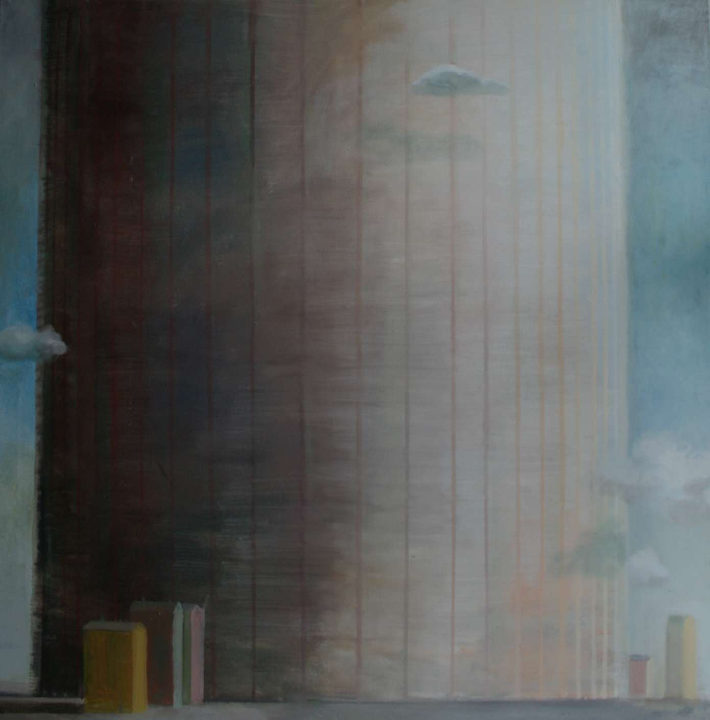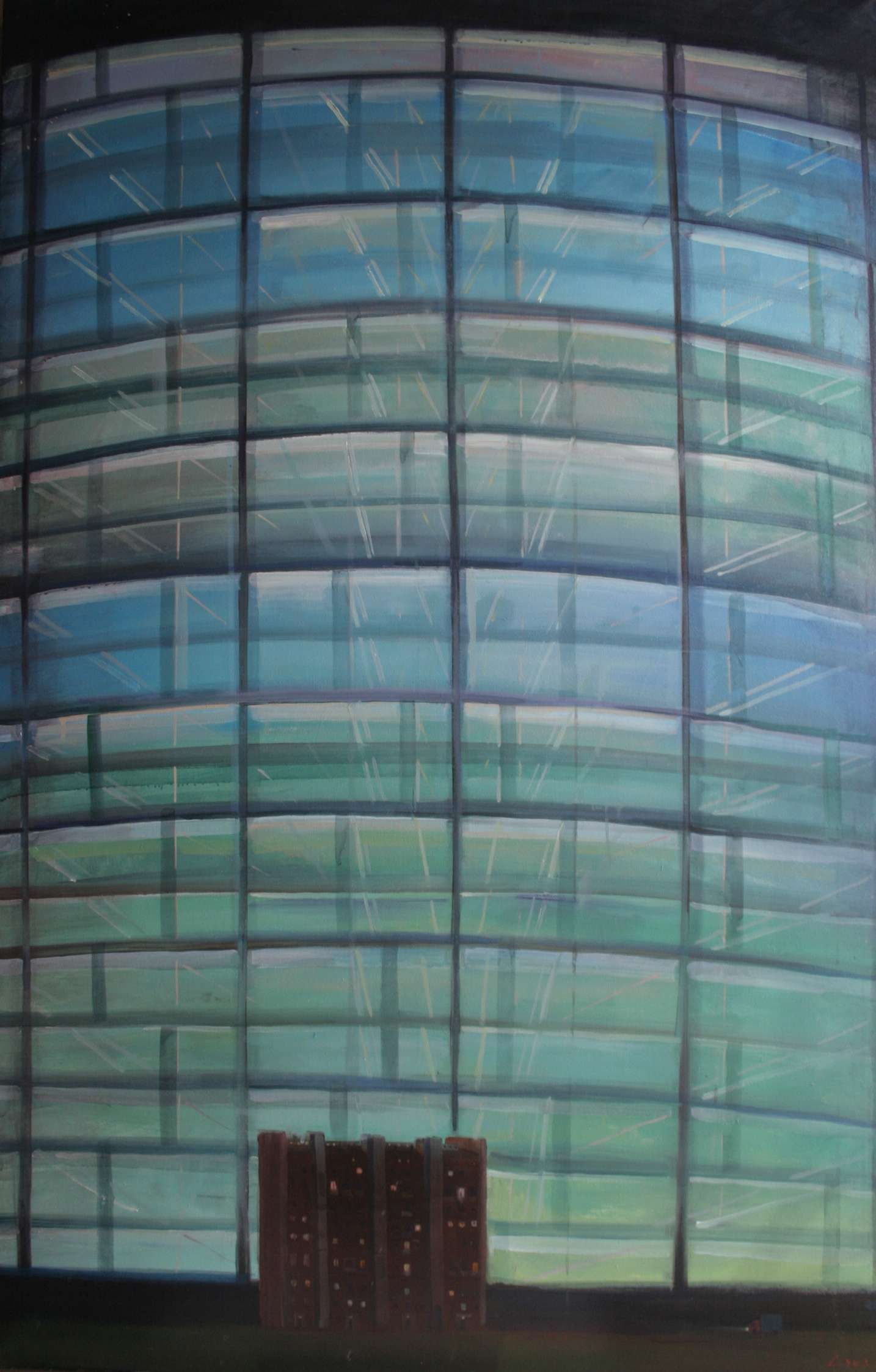 Живописец Андрей (Дюдя) Сарабьянов, отчасти лирик, отчасти мастер широкого и темпераментного мазка, высказывается во многих жанрах: портрет, натюрморт, городской пейзаж. Сегодня разговор о последнем: «Серия началась в 2008-2009 году, - говорит художник. - Поначалу это были живописные зарисовки о новой Москве. Строительство небоскребов и их соотношение с московскими домами сталинского времени. Условный взгляд и фантазия о будущем Москвы, где на фоне гигантских бесформенных глыб, архитектура середины ХХ века выглядит беззащитной и одинокой». Тема возникла не случайно. Окна мастерской Андрея выходят на небоскребы Сити и на жилые постройки середины прошлого века, в свое время тоже казавшиеся грандиозными. Нынешний же городской контекст им оставлет роль милого, уютного, но постепенно сходящего со сцены, воспоминания, почти что призрака. Сопоставлением масштабов, форм, состоянием природы, отсутствием человека и потухшими окнами Сарабьянов поэтизирует следы былой урбанистической культуры. Ее образец, дом под номером 9/3, в котором живет сам художник.
