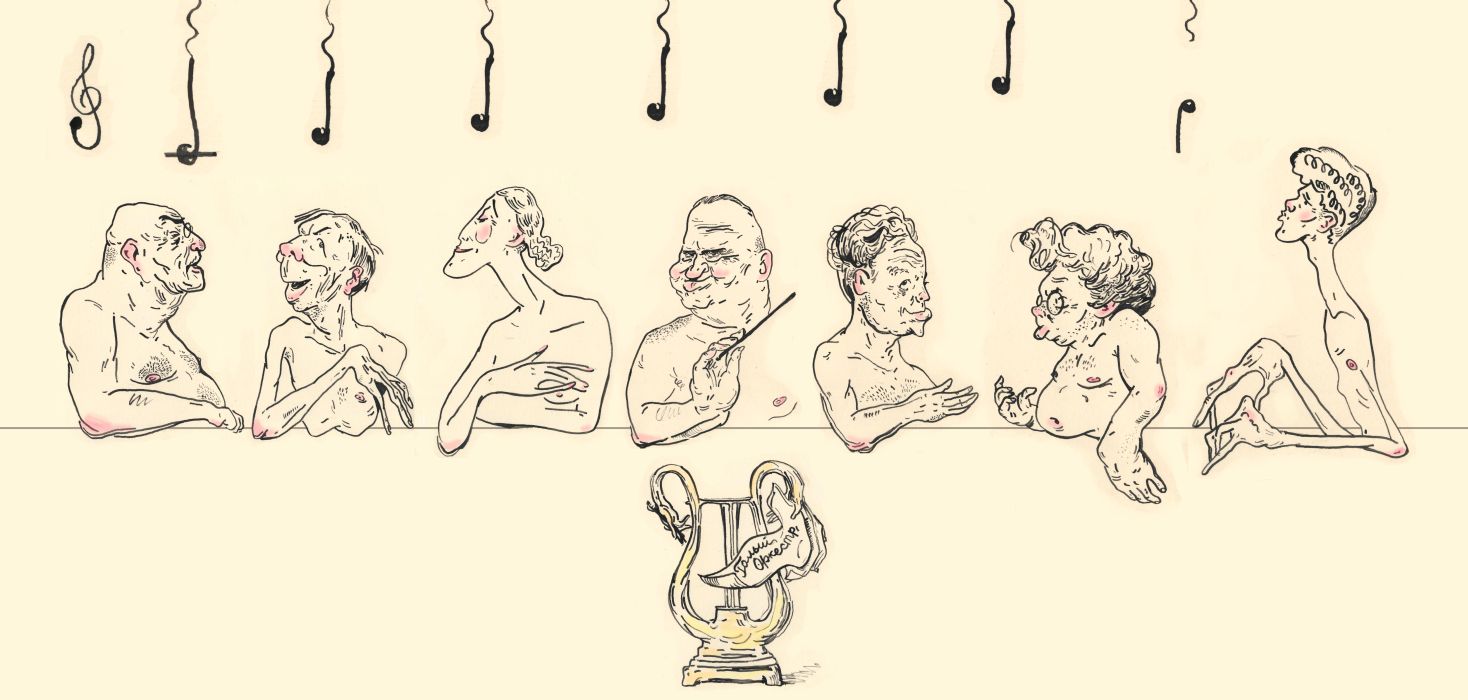 Дмитрий Рязанов. Портреты нот. Каприччио в духе Кукрыниксов. 2014. Бумага, тушь.