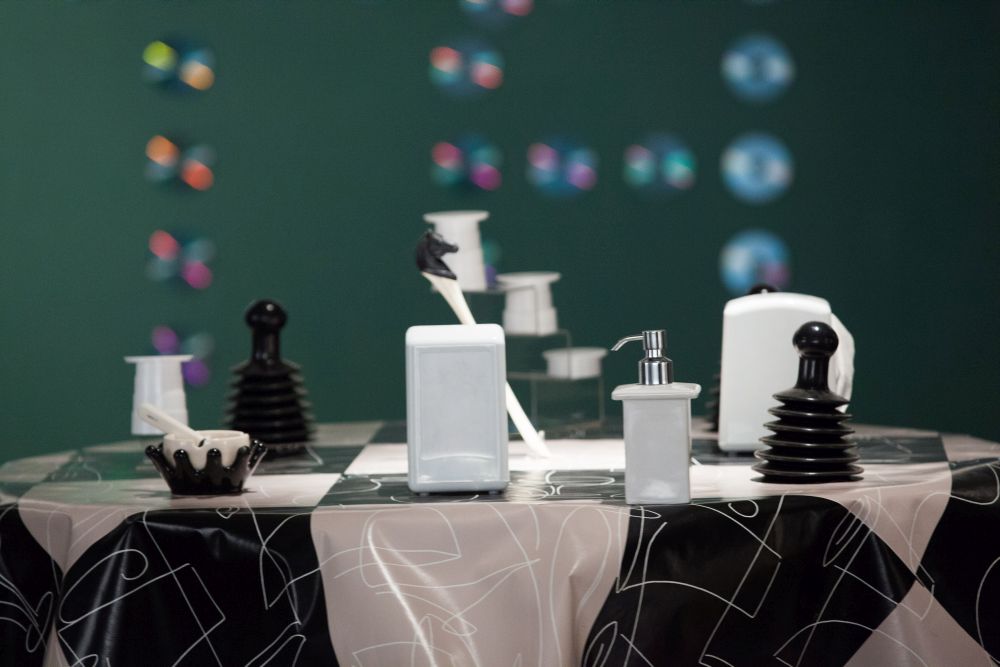 Каждый художник остроумно отвечает на задания кураторов. Один из «классиков московского концептуализма» Вадим Захаров в работе «Калинка. Русская народная песня» использует прямые образы: нотные линейки из колючей проволоки с нотами-апельсинами. Александр Панкин в своих картинах шифрует философские идеи Гвидо Аретинского – изобретателя нотной записи, линеек и октав. Андрей Филиппов привычные CD складывает в наставительное латинское NOTA BENE. Инсталляция ««Bon Appéti» Яна Тамковича предлагает сервированный стол из реди-мейдов, на котором происходит столкновение кубизма с дадаизмом. Его нотации из свихнувшихся обыденных вещей заставляют вспомнить и Дюшана (который, кстати, очень любил шахматы), и, конечно же, шахматную партию, разыгранную «как по нотам» в кэрролловской «Алисе в Зазеркалье».