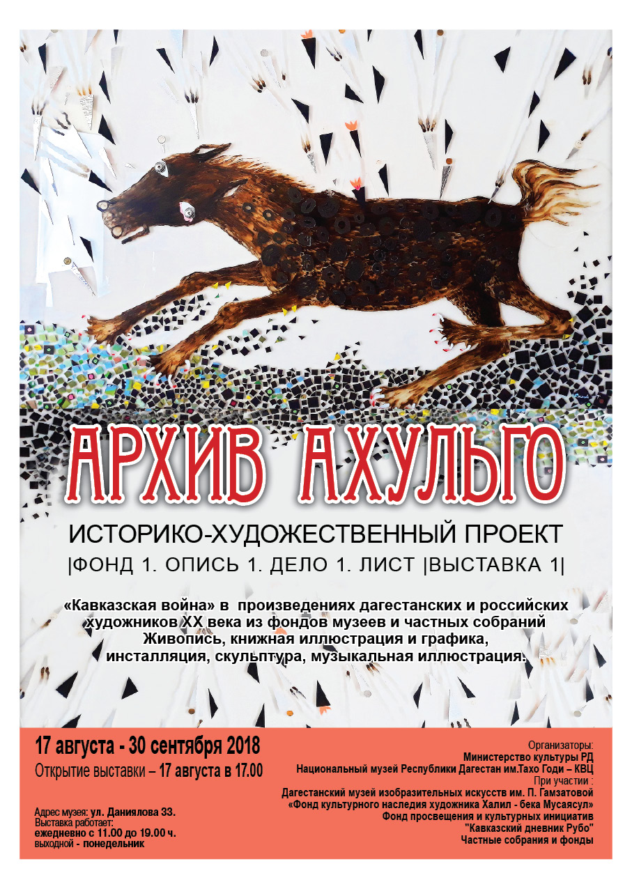 В экспозицию выставки включен эскиз –копия панорамы Франца Рубо «Штурм аула Ахульго» (1890, копия – 1997, СВХ им. Грекова, Москва) . Это центробежный , и одновременно авангардный объект общего замысла выставки, вокруг которого и строится разговор, что есть в «Архиве Ахульго» на сегодня. Авторами нашего проекта стали : Халил бек Мусаясул, Магомед-Каир Юнусилау, Хасбулат Аскар-Сарыджа, Эдуард Акуваев, Ибрагим Халил Супьянов, Магомед Моллакаев, Гамид Балиев, Андрей Забажанов, Саид Тихилов, Мурад Халилов, Магомед Дибиров, Муса Гайворонский, Анна Самарская, Тагир Гапуров, Елена Гапурова, Зайнутдин Исаев, ВRО, Николай Филатов (Москва), Татьяна Ваганова (Адыгея), Анна Слатова (Санкт-Петербург).
