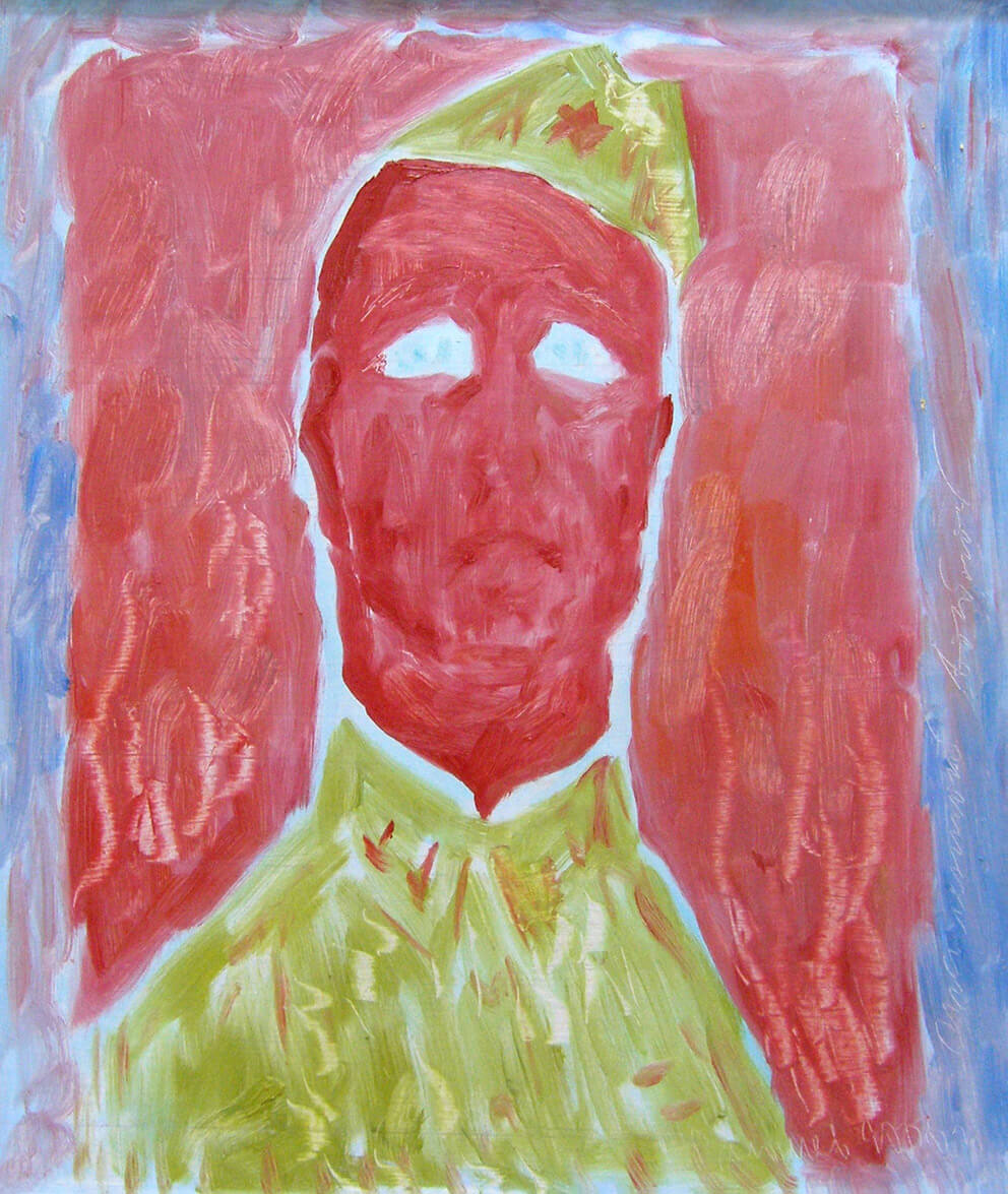 На выставке много портретных образов близких людей - родственников и земляков. Один из них в картине «Опаленный войной». «Здесь мой дядя Конев Иван. Он пришел с фронта во второй год войны, побыл десять дней и потом ушел навсегда. Весь он пропитан этой войной, краснотой этих взрывов, а глаза совершенно светлые. Таким он запомнился мне, когда мы его встречали».