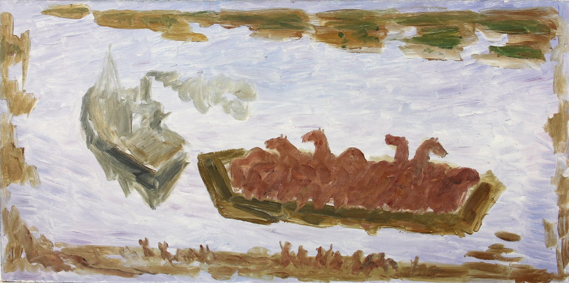 Программный сюжетный мотив о войне связан с монументальной композицией «Пароход Пономарев», в разном прочтении, начиная с 1970-х годов. «…Пароход, увозящий людей на войну. Из нашего селения увозили на промысловом катере, который для меня, ребенка, запомнился огромным. Его заполнили полностью, было так много людей, что катер качался с одной стороны на другую. Гармонист играл прощальную музыку. Это состояние проводов как монументальное, трагическое явление запечатлелось в моей памяти и в картинах. …Условные люди, машущие руками, гармонист, удаляющийся от нас. А потом это все превращается в ритм, в состояние толпы, которое уходит вместе с этим пароходом».