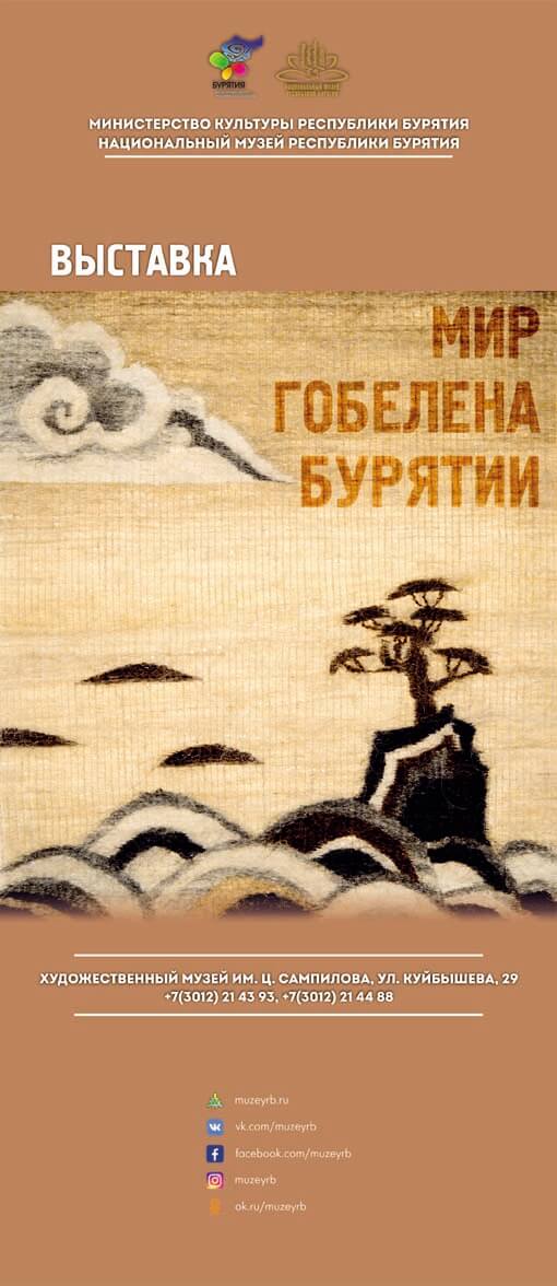 «Мир гобелена Бурятии» - это художественное пространство этнической Бурятии, наполненное авторскими интерпретациями тем и сюжетов, средств выразительности и приемов ткачества из шерсти, конского волоса, акрила. В экспозиции представлено около 40 экспонатов, произведения 20-ти авторов - классический гобелен из шерсти, конского волоса, нетканый гобелен, панно и женские ювелирные украшения с использованием конского волоса. Большую часть экспозиции составили произведения из авторских коллекций, также, вошли работы из фондов Художественного музея им. Ц. Сампилова и музея Истории Бурятии им. М.Н. Хангалова (Национальный музей РБ), Усть-Ордынского Национального центра художественных народных промыслов (Иркутская область), колледжа традиционных искусств народов Забайкалья (с. Иволгинск, г. Улан-Удэ), колледжа искусств им. П.И. Чайковского и Восточно-Сибирского института культуры (г. Улан-Удэ). На выставке уделено внимание предметам этнографического плана кон. XIX в.-нач. XX в. – это бурятские утилитарные бытовые предметы, сплетенные и сотканные из конского волоса,
