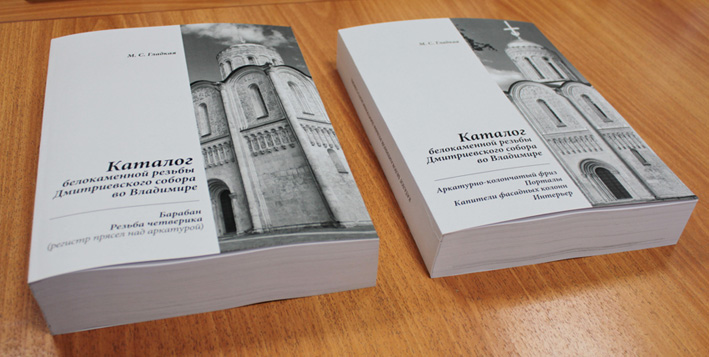 Гладкая М. С. Каталог белокаменной резьбы Дмитриевского собора во Владимире : Аркатурно-колончатый фриз, порталы, капители фасадных колонн, интерьер / М. С. Гладкая. — Владимир : Владимирская областная универсальная научная библиотека, 2018. — 872 с. : ил. — (Дмитриевский собор во Владимире : материалы и исследования ; вып. 8).