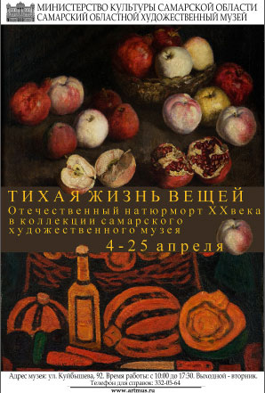 На выставке представлены натюрморты самарских художников. Работы Г.С.Чернухина, многие годы прожившего в Узбекистане, «Мужицкий натюрморт» (1978) и «Две птицы» (1973) воплощают чувственную плоть предметного мира.