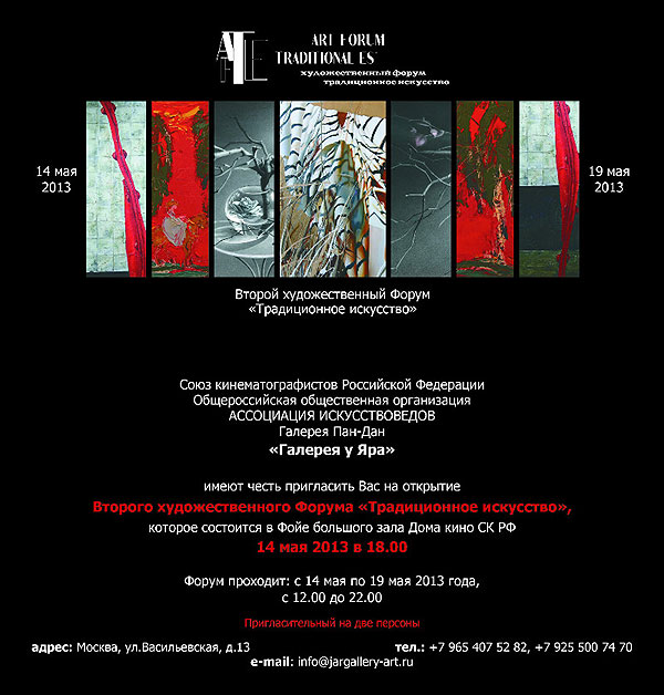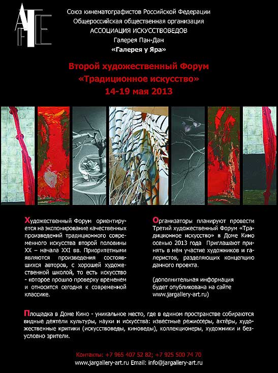 В легендарном Доме Кино состоится Второй художественный Форум «Традиционное искусство». В Форуме участвуют галереи и художники, представляющие качественные произведения, выполненные в традиционных жанрах и техниках. Широкий спектр творений современного искусства порадует зрителей. Реалистические работы, построенные на ассоциативном осмыслении культуры прошлого, мифологическое искусство, экспрессионизм, концептуализм, неогипереализм, примитивизм, неоимпрессионизм, нонконформизм – неполный перечень направлений, представленных на Форуме.