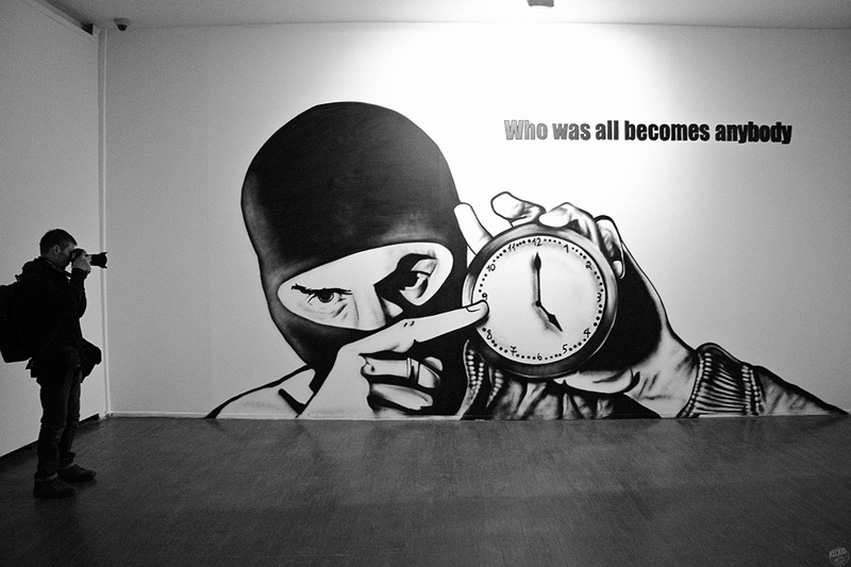 Главной же работой выставки безусловно можно назвать граффити, изображающее протестного активиста в закрывающей лицо маске-балаклаве и с часовым механизмом в руках. Граффити сопровождает в высшей степени провокационная надпись с перефразировкой известных строк Интернационала "Кто был всем, станет никем" (Who was all, becams anybody).