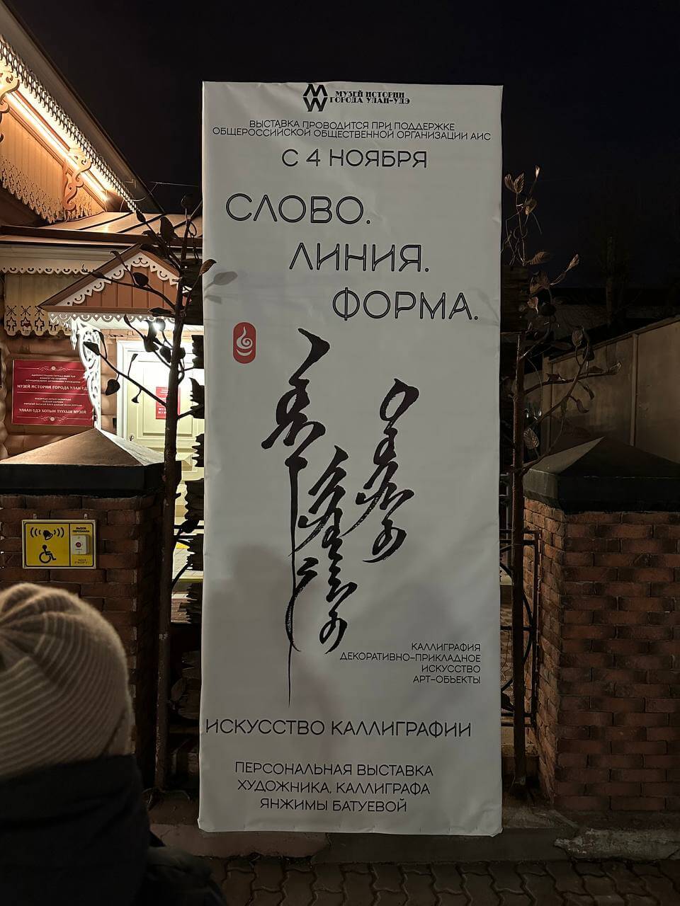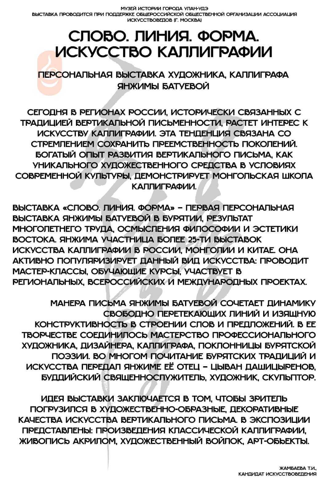 Выставка «Слово. Линия. Форма» – первая персональная выставка Янжимы Батуевой в Бурятии. Результат многолетнего труда, осмысления философии и эстетики Востока. Янжима участник более 25-ти выставок искусства каллиграфии в России, Монголии и Китае. Она активно популяризирует данный вид искусства: проводит мастер-классы, обучающие курсы, участвует в региональных, всероссийских и международных проектах.