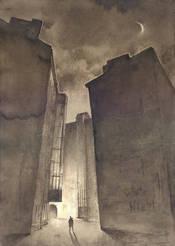 Подобным холодом и нелюдимостью полны городские пространства в иллюстрациях Ильи Глазунова к произведениям Ф. М. Достоевского и рисунки Трауготов к стихам А.А. Блока. Эти примеры имеют продолжение и в наши дни. Например, в экзистенциальной фотографии Александра Скибицкого (рис. 3,4), или в графике петербургского художника Олега Ильдюкова (рис. 5, 6).