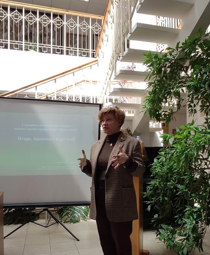 Доклад Юлии МихайловныТютюновой - кандидата педагогических наук, доцента, заведующей кафедрой рисунка ОГУ имени И.С. Тургенева», члена Ассоциации искусствоведов был посвящён двадцатилетней педагогической деятельности Круглого на художественно-графическом факультете, его участию в становлении художественного образования в Орле.